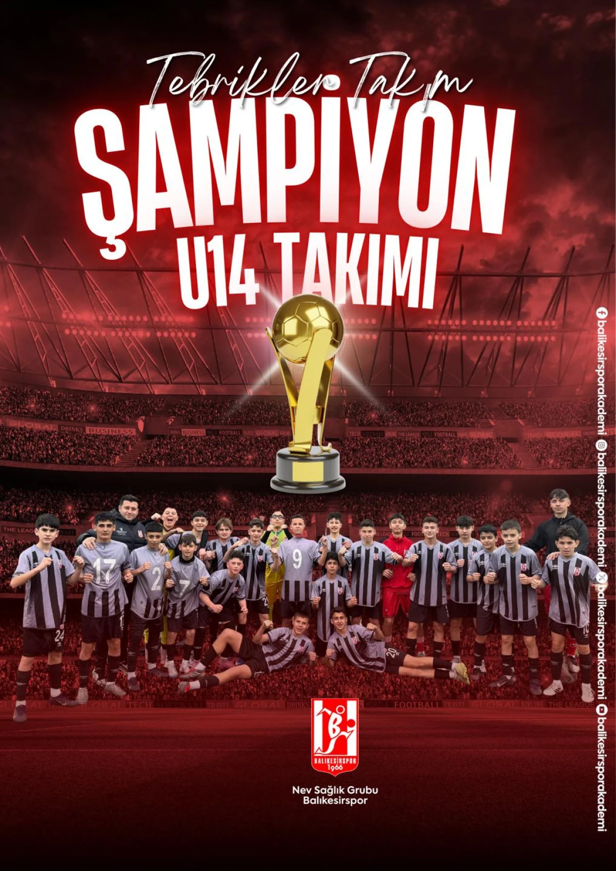 Nev Sağlık Grubu Balıkesirspor’un U14 takımı haftalar öncesinden garantilediği şampiyonluğu sezonun son maçında Tavşanlı Erdemspor’u yenerek taçlandırdı.